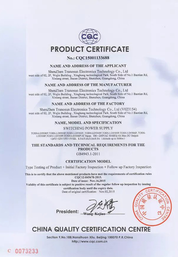 TOSN-LD5500P-CQC certificate in English